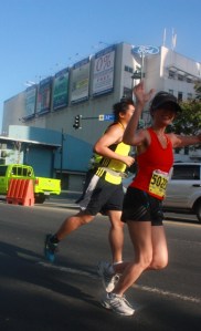 We maintained the pace -Jopeng, Jim and Michi…high five each other for each kilometer done! We are nearing halfway! I had my 2nd GU gel at that time. Nearing the turnaround point, we saw friends running back. It feels good cheering each other as we make our way to the 22nd k.
