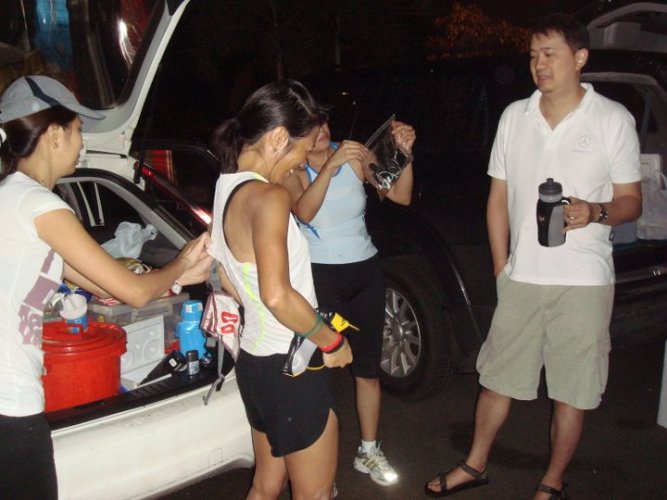 I really planned to make a quick pit stop at the 50 kilometer marker. However, given my red letter situation, I had to take some time during the break. It took me 30minutes for the CR break, eat, change clothes, change shoes, massage, glide, sun block. I did everything at the same time with the help of my Yaya’s err sisters and friends. I decided to wear the same shorts since I already have tan lines with the shape of my K-swiss shorts (and it’s the most comfortable one that I have – soft and light)