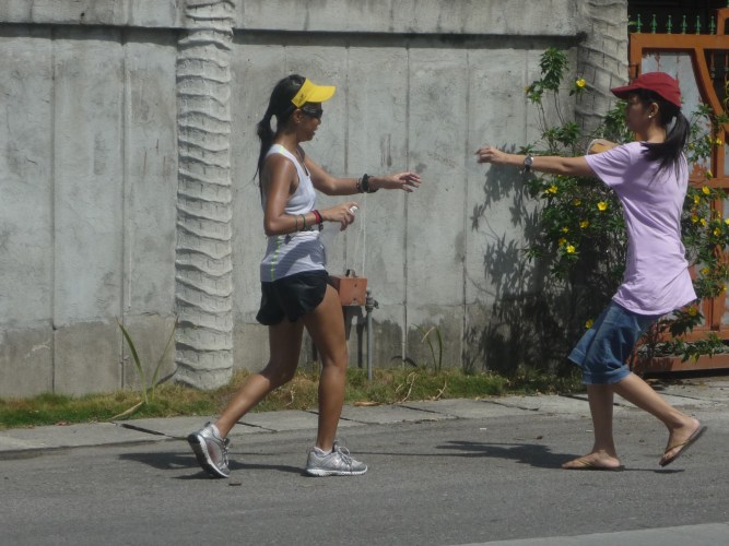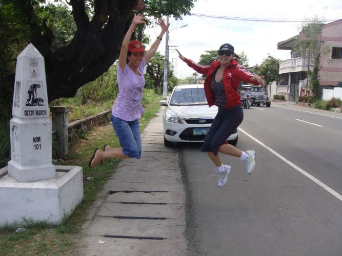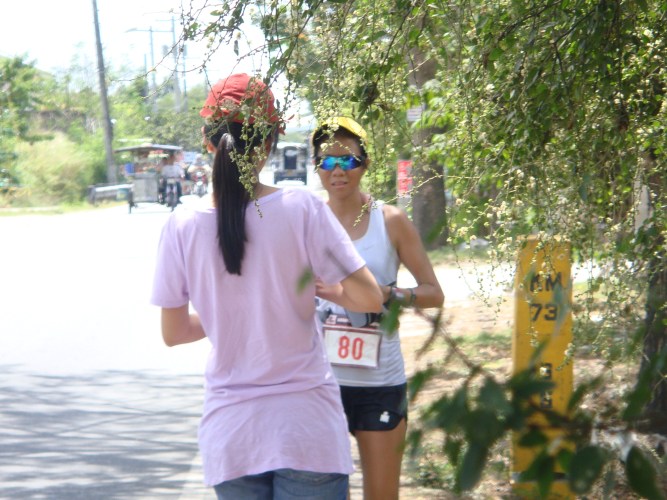 I took each stride by trying to alternate humming the beeping sound of the cadence gauge that I use during training; and by praying an Our Father and Glory Be every time I feel tired. I brisk walk as I approach my support vehicle on each stop. My next goal is to go past the area where there is road construction. This would lead us to the town of Guagua. I visualize each goal and pat myself on the shoulder as I reach them. (I don’t actually pat myself but I rejoice within. This is probably why in all my pictures, I was smiling.)