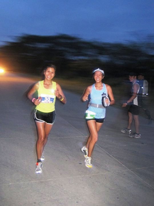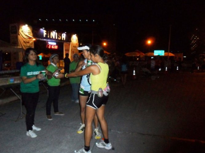 It was still dark as we run. The bright full moon, lampposts and the mobile lighting from the organizers lighted our path. It was paved road, so no way should I have tripping incident. I let Len ran her pace; I stayed by her side making some comments and stories every now and then. Probably due to lack of warm up, I was huffing and puffing at the start. When we reached the 24th kilometer mark, I wanted to say %&@# that was just 2 kilometers! Of course, I couldn’t. So I said, “Only 18 kilometers to go!” At the first aid station, we stopped to put on some pain killer to massage and freshen up her legs as a preventive measure. The guy at the aid station put on his gloves and looks quite conscious on touching Len’s legs. I grabbed the bottle, and quickly massaged Len’s legs.