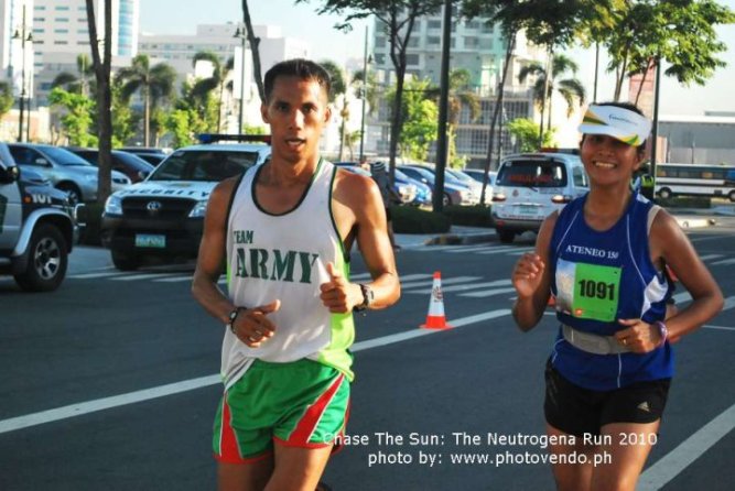 Between km 25 to 30, the hills were already taking a toll on my tired legs. I was ready to walk but she would motivate me by telling me to adjust my gait or do some of the running drills taught to us. At one time when she went to refill at one of the hydration stations, I started walking. When she caught up with me she said: “Do a brisk walk or jog. Or else lactic acid will accumulate.” So I jogged. She gave me one salt cap and after asking me many times if I wanted her to wear my hydration belt, I finally gave in. It was then I noticed that Tin’s gait changed. I knew then that maybe her knee was hurting. It was something that she felt during the 102km Bataan Death March. But Tin gave me no chance to ask her about it because she kept on motivating me all throughout.